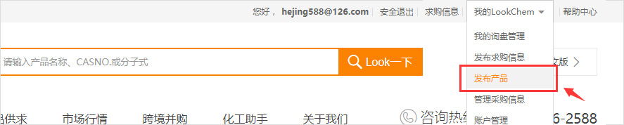 1、打開 m.laketravismountaintoplodge.com 點擊頂部右側(cè)“我的Lookchem”,點擊“發(fā)布產(chǎn)品”