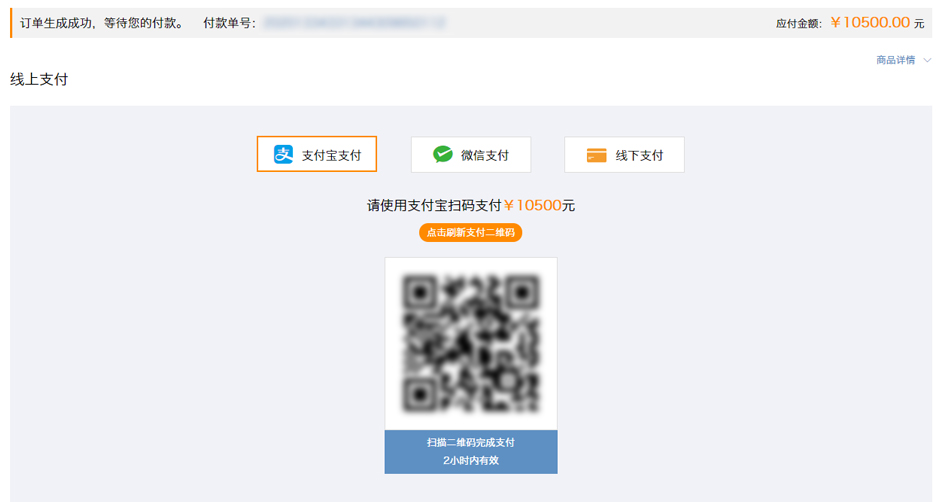 在提交訂單后,自動(dòng)跳入支付頁面,支持微信支付、支付寶支付。